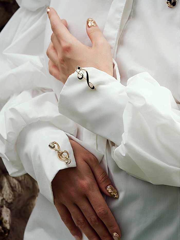 - Материалы и дизайн: металлическая основа с золотистым покрытием гармонично сочетается с чёрной эмалью, создавая контрастный и лаконичный образ.