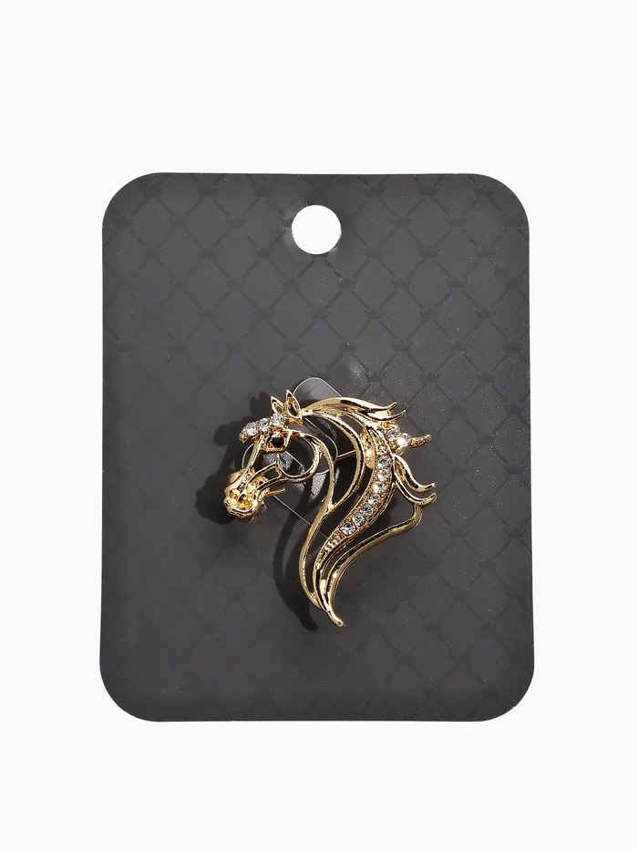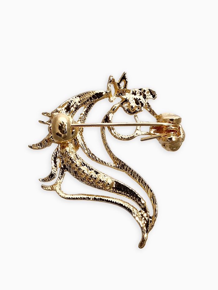 Благородство конского профиля в золотом ореоле Женская брошь с белой лошадью – очаровательный аксессуар, пропитанный философией мудрости и власти животных. Исключительно красивая форма украшения стала результатом кропотливой работы мастеров, воплотивших силу и красоту лошади в ювелирном изделии.