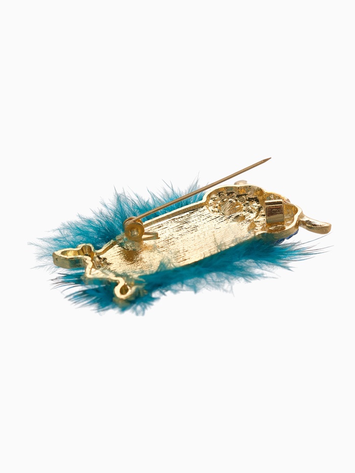 Металлическая основа с золотым покрытием обеспечивает прочность и долговечность, а вставки из перьев и сверкающих страз придают изделию лёгкость и изящество. Такая брошь станет универсальным украшением, которое подчеркнёт индивидуальность и стиль женщины любого возраста, идеально вписываясь как в повседневный, так и в праздничный образ.