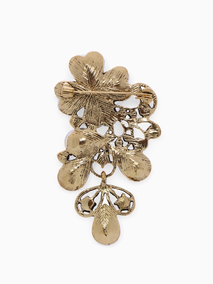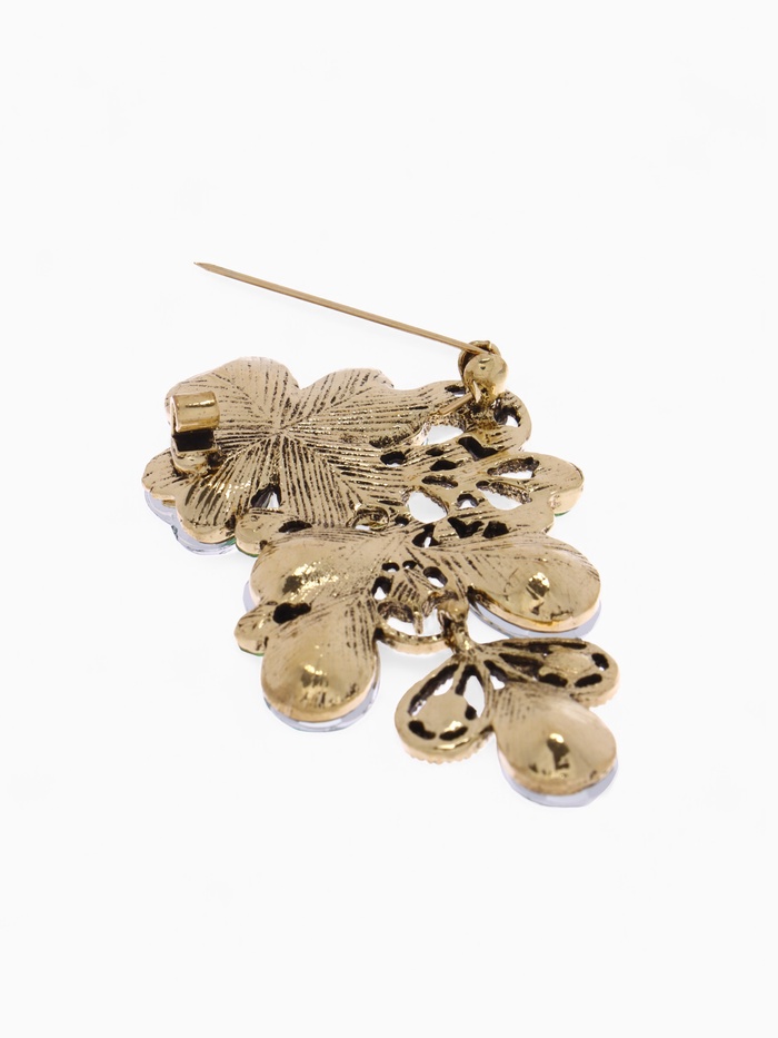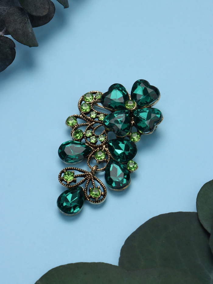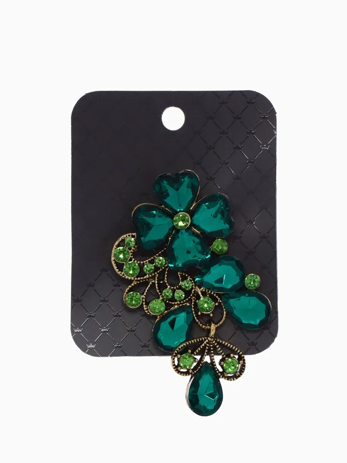Изысканная брошь с изумрудным оттенком, выполненная в технике чернёного золота, представляет собой настоящее произведение искусства, вдохновлённое природной красотой цветочной лозы. С длиной 6,5 см и изящным сочетанием металла с вставками из полистоуна и сверкающих страз, она станет элегантным акцентом в любом образе.