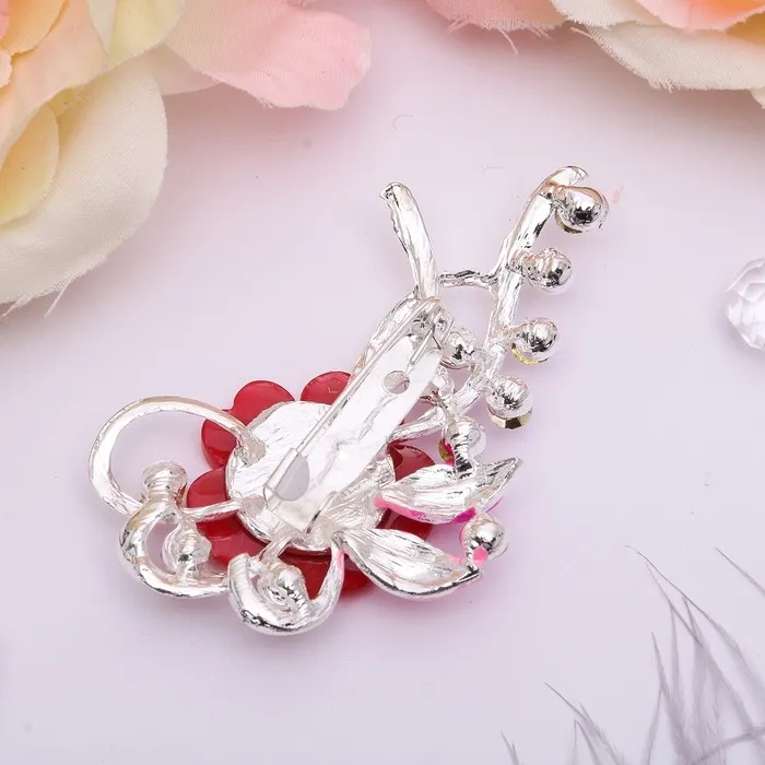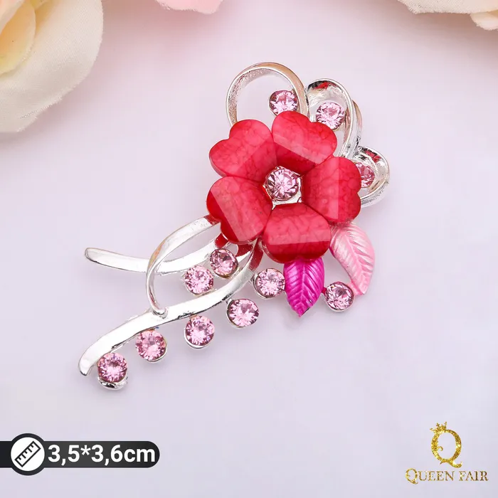 Размер 3,5 см делает брошь универсальной для ношения на одежде, шарфах или сумках, подчёркивая женственность и изысканный вкус. Металлическая основа обеспечивает прочность и долговечность, а вставки из эмали, страз и пластика придают изделию блеск и глубину цвета.