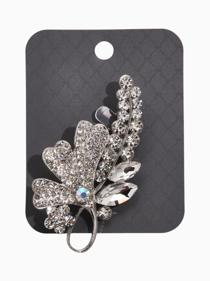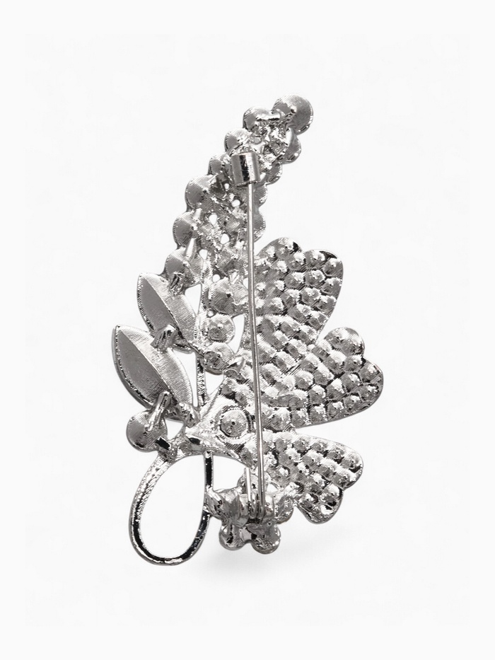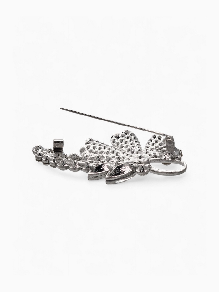 Серебряная филигрань изящно оттеняется мелкими прозрачными стразами, символизирующими нежные соцветия, что придаёт изделию лёгкость и аристократизм. Основа броши изготовлена из качественного металла, покрытого зеркальным серебряным напылением, подчеркивающего изысканность отделки.