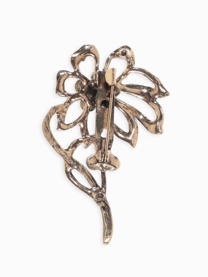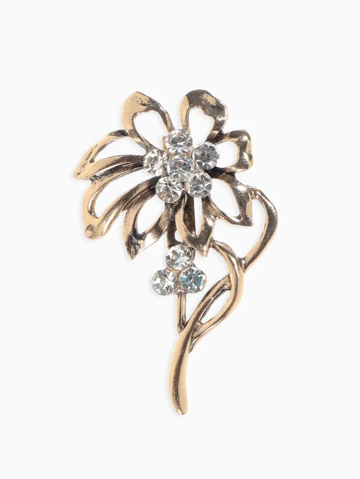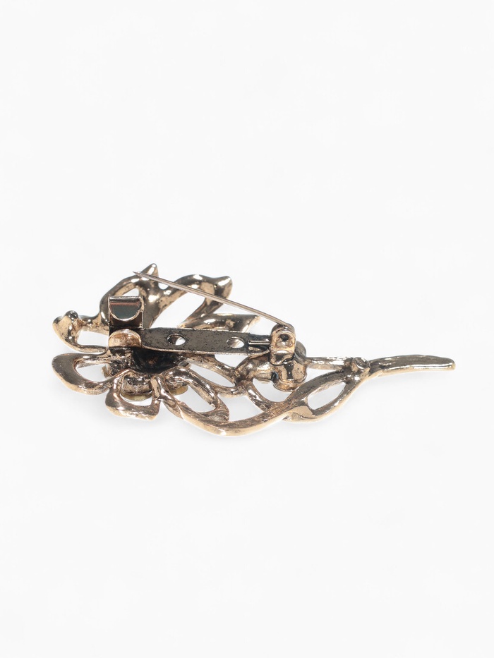 Металлическое основание с чернёным золотом создает эффектный контраст с белыми стразами, которые переливаются на свету, добавляя нотку утонченности. Эта брошь идеально подходит как для повседневного, так и для вечернего наряда, делая вас центром внимания в любой ситуации.