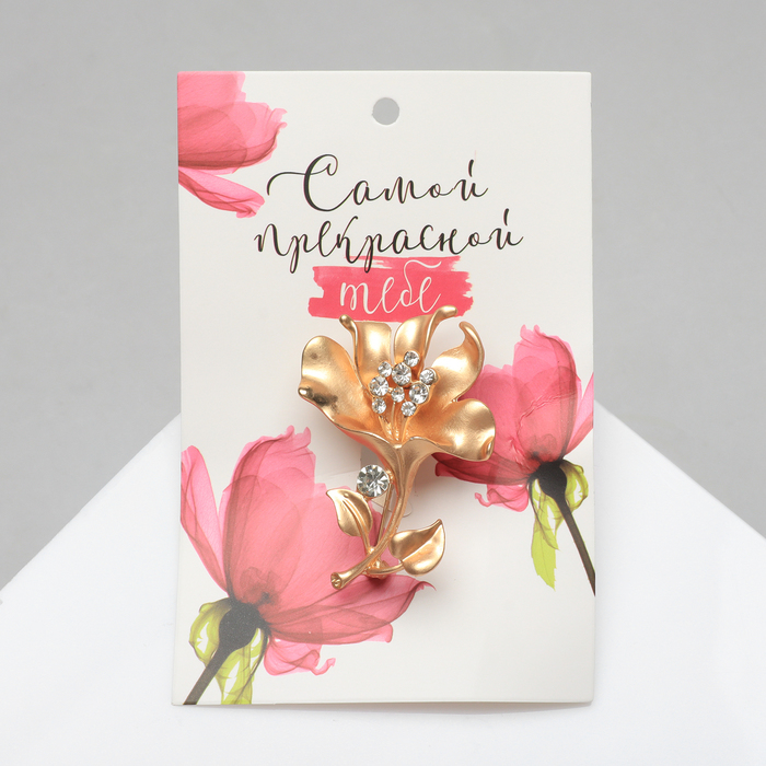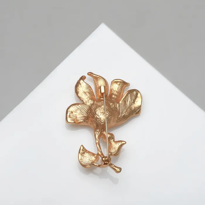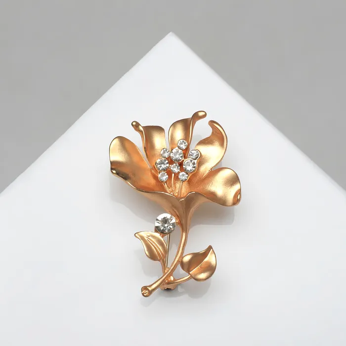 Изготовленная на металлическом основании с золотистой фурнитурой, брошь украшена блестящими стразами, которые деликатно играют на свету, создавая эффект живого цветка. Длина в 5 см делает изделие заметным, но одновременно элегантным акцентом, подходящим как для повседневной носки, так и для особых случаев.