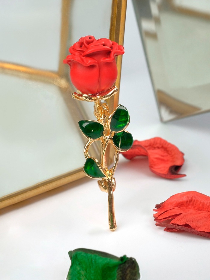 Женственный акцент с природным мотивом. Изящная брошь в виде розы с красно-зелёными эмалевыми лепестками и золотистым основанием станет эффектным дополнением образа.