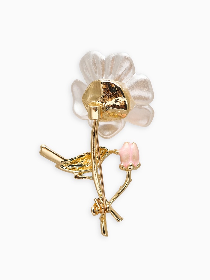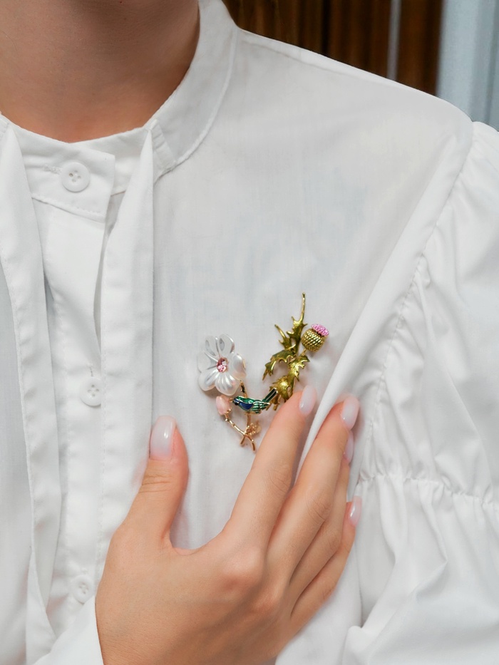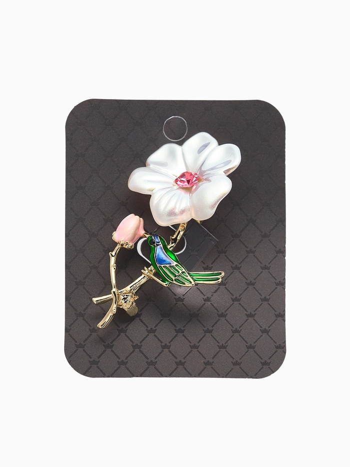 Тонкая проработка деталей создаёт живое впечатление: нежные лепестки цветка и лёгкие крылья птички словно оживают благодаря насыщенным цветам и блеску декоративных элементов. Золотистый оттенок основы придаёт изделию благородство и долговечность, а сочетание эмали и страз обеспечивает насыщенность и игру света при каждом движении.