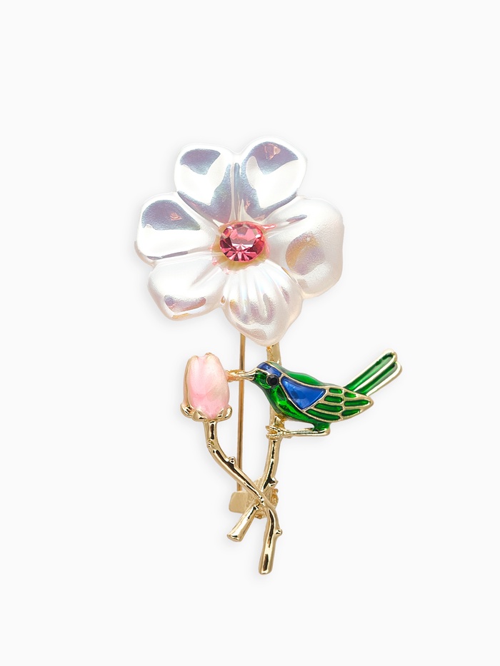 Тонкая проработка деталей создаёт живое впечатление: нежные лепестки цветка и лёгкие крылья птички словно оживают благодаря насыщенным цветам и блеску декоративных элементов. Золотистый оттенок основы придаёт изделию благородство и долговечность, а сочетание эмали и страз обеспечивает насыщенность и игру света при каждом движении.