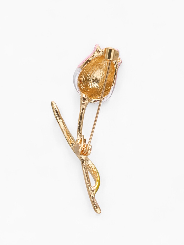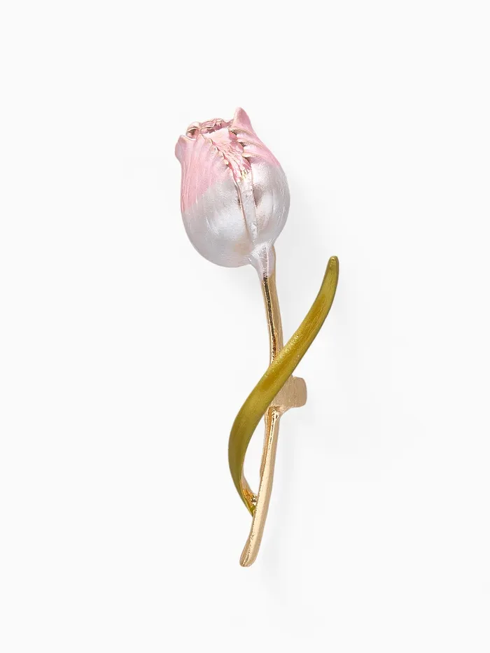 Эта брошь с изображением тюльпана и пионовидных цветов выполнена из металла с эмалевым покрытием в нежных бело-розовых оттенках, украшена золотой фурнитурой. Ее длина составляет 6 см, что делает ее изящным украшением для женщин и девушек. Такой аксессуар отлично подчеркнет женственность и добавит образу нотки романтики и природной красоты.