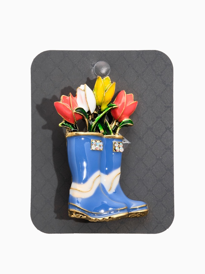 Оцените очарование и свежесть весны с брошь в виде тюльпанов, расположившихся в сапожках, выполненных в разноцветной гамме и оформленных в эффектном черном золоте. Этот уникальный аксессуар, посвященный природе и садоводству, привнесет яркие пятна цвета и хорошего настроения в ваш образ.