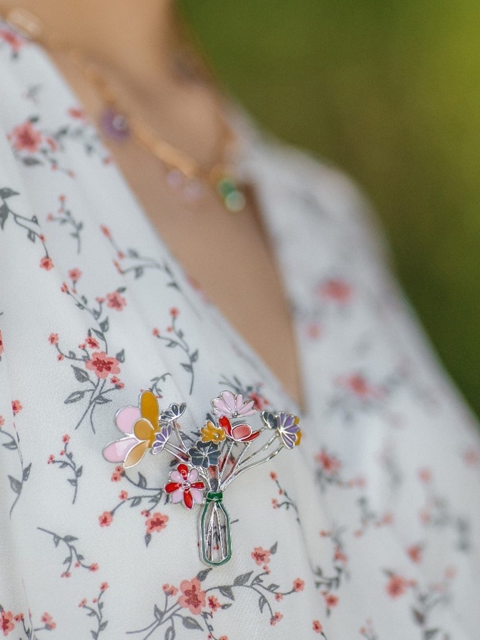 Брошь «Цветы» в вазе, цветная в серебре — Характеристики