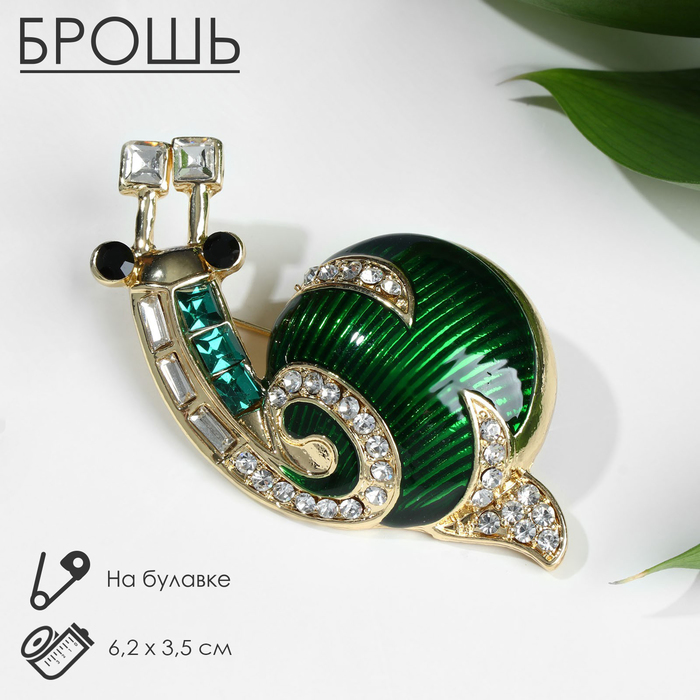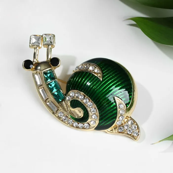 Брошь в форме улитки с изящным сочетанием белого и зелёного оттенков на золотистом фоне — это украшение, которое привносит в образ лёгкость и утончённость. Размеры 6,2 и 3,5 см делают изделие заметным, но при этом удобным для повседневного ношения. Использование металла с золотым покрытием, а также вставок из эмали, стекла и страз, создаёт эффект многогранности и глубины цвета.
