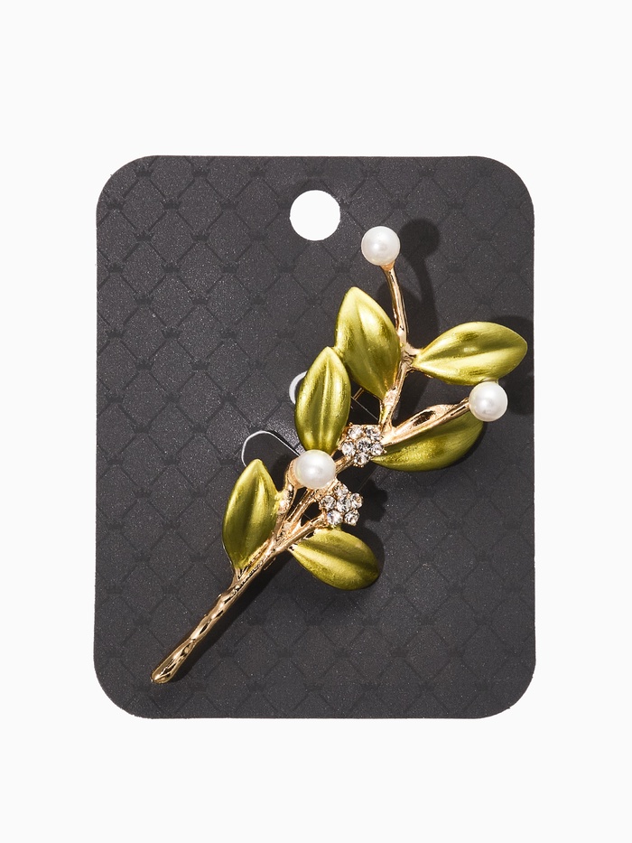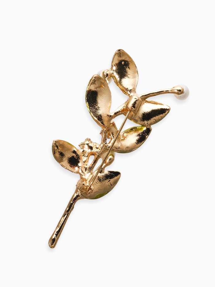 Нежная веточка с жемчужинами оживит ваш образ и наполнит его тонкими штрихами роскоши. Компактная брошь в духе природных мотивов имеет длину около 6,5 см и воплощает уникальную комбинацию белого жемчуга и свежей зелени, гармонично интегрированных в золото. Это изделие станет вашим верным спутником, подчёркивающим красоту лица и линии шеи.