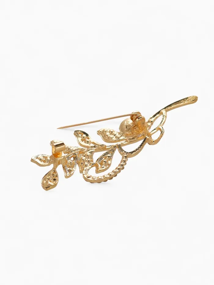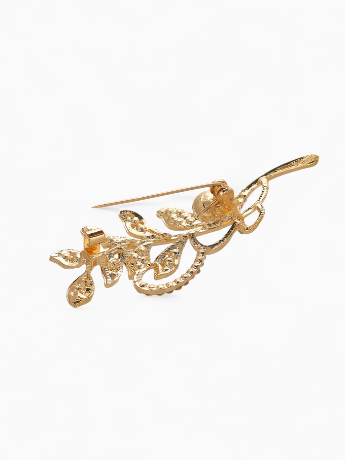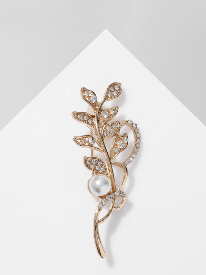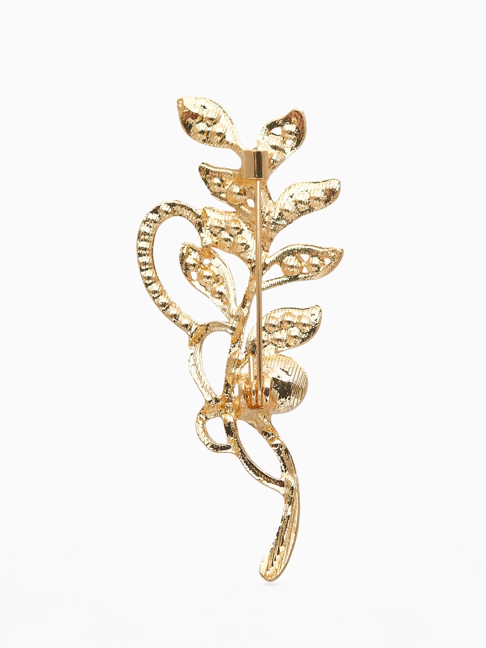 Изысканная брошь в форме ветви с искусственным белым жемчугом и сверкающими стразами раскрывает нежность и природную гармонию в каждом изгибе. Золотистый металлический каркас придаёт изделию благородство и тепло, подчёркивая утончённый вкус и индивидуальность обладательницы.