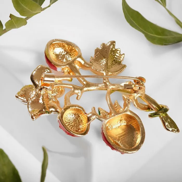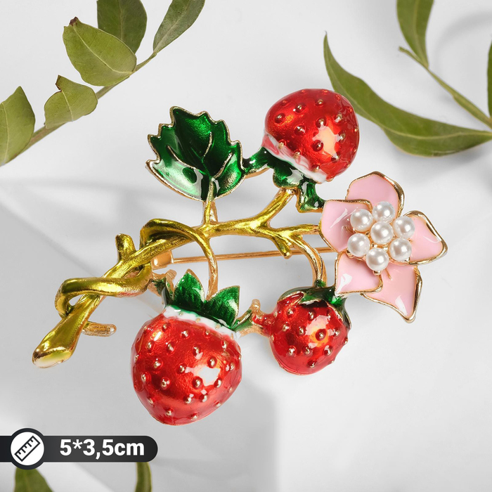 Насыщенные красные ягоды земляники, словно ожившие на изящной броши, придают образу свежесть и естественную красоту. Изделие выполнено из прочного металла с золотистым покрытием, что подчёркивает его благородство и долговечность. Размер 5 см позволяет украшению стать заметным, но при этом не перегружать образ.