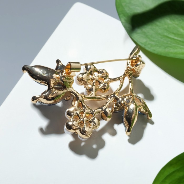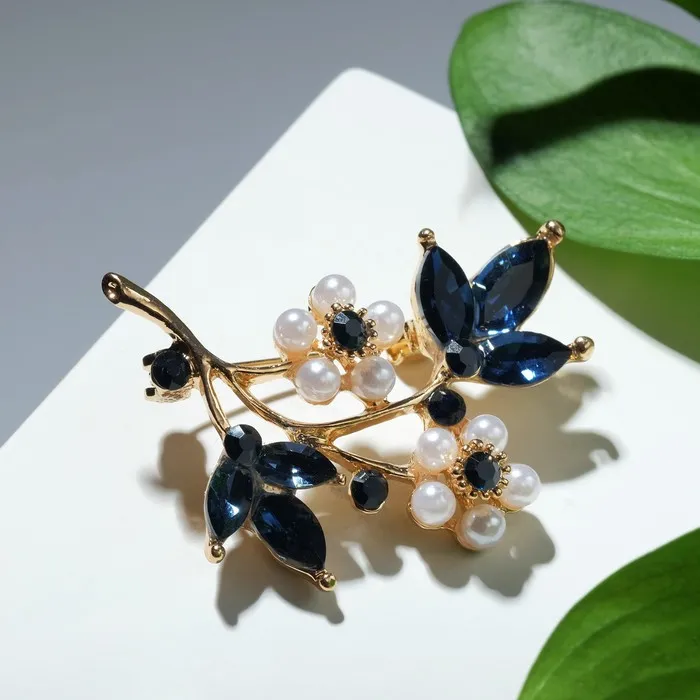 Брошь «Жемчужные цветы» со стеклянными листами, цвет бело-синий в золоте — Характеристики