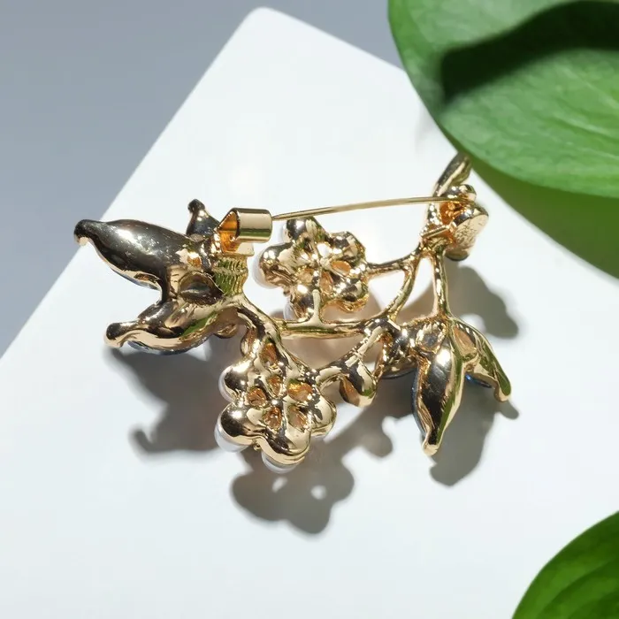 Металлическая основа с золотым покрытием придаёт изделию благородство и долговечность, а тщательно подобранные вставки из искусственного жемчуга, страз, акрила и пластика обеспечивают игру света и объёма, подчёркивая природную тематику цветочного мотива.