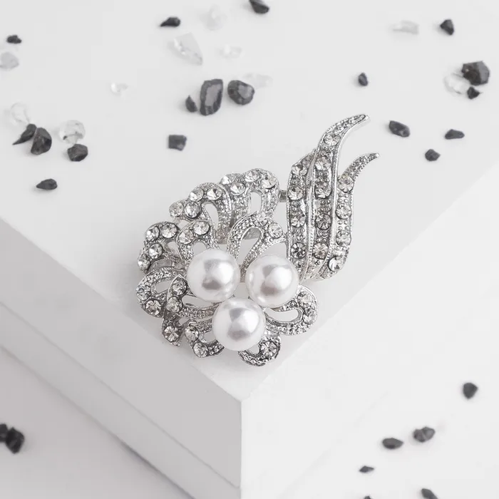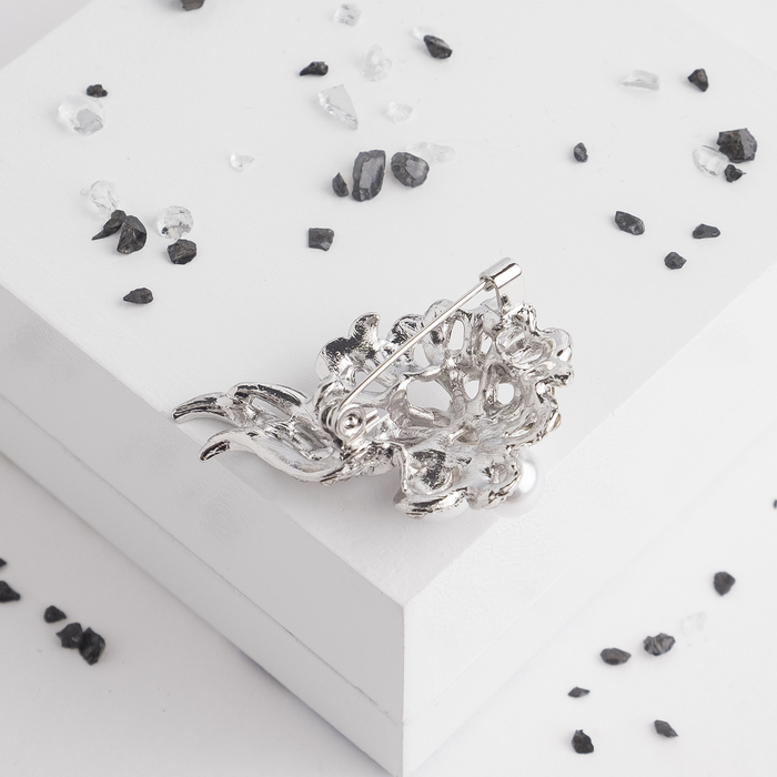 Металлическая основа с серебряным покрытием подчёркивает воздушность дизайна и придаёт изделию благородный блеск. Искусственный жемчуг и аккуратные стразы создают эффект нежного сияния, делая брошь заметным, но при этом ненавязчивым акцентом. Такое украшение станет универсальным подарком для мамы, бабушки, дочери или внучки, подходящим для любого повода.