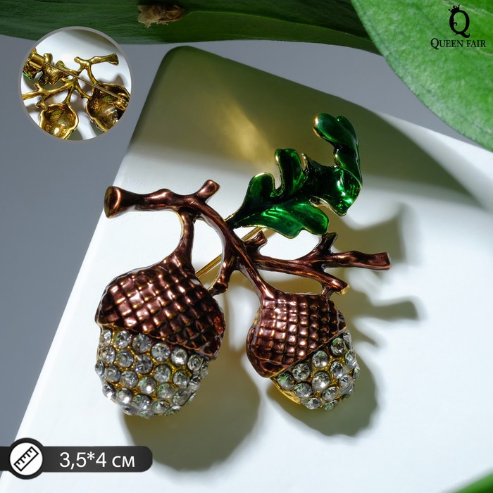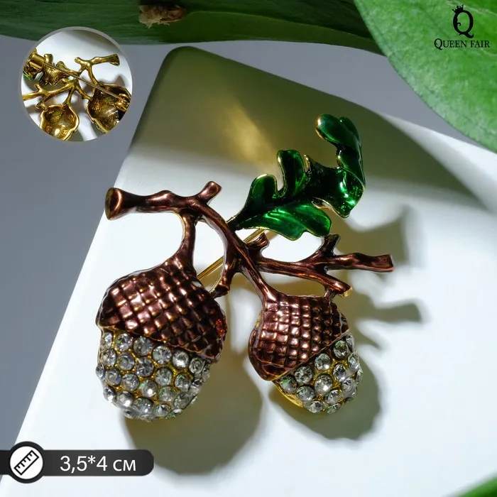 Эта изящная брошь, выполненная из бижутерного сплава с эффектом чернёного золота, сочетает в себе природную гармонию и современный стиль. Небольшой размер в 3,5 см делает её универсальным украшением, которое легко дополнит как повседневный, так и праздничный образ. Бело-зелёные эмалевые вставки и сверкающие стразы создают живописный образ жёлудей, символизирующих силу и возрождение.