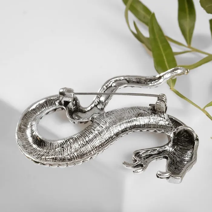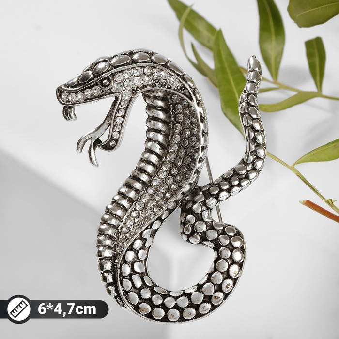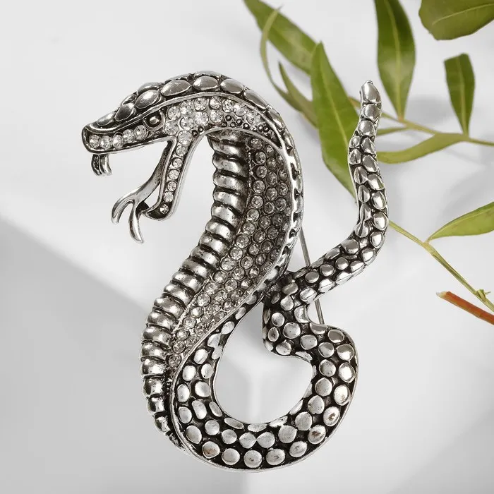 Эта брошь в виде кобры — воплощение силы и элегантности, выполненная из металла с эффектом чернёного серебра и украшенная белыми стразами. Длина изделия 6 см позволяет ей стать заметным акцентом в образе, придавая ему загадочность и утончённость.