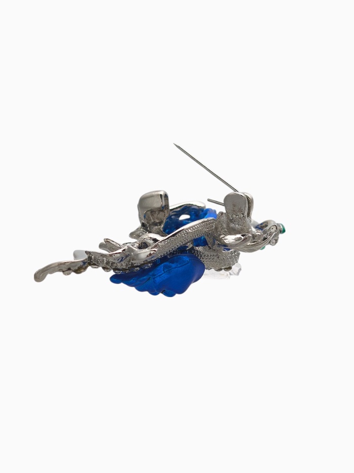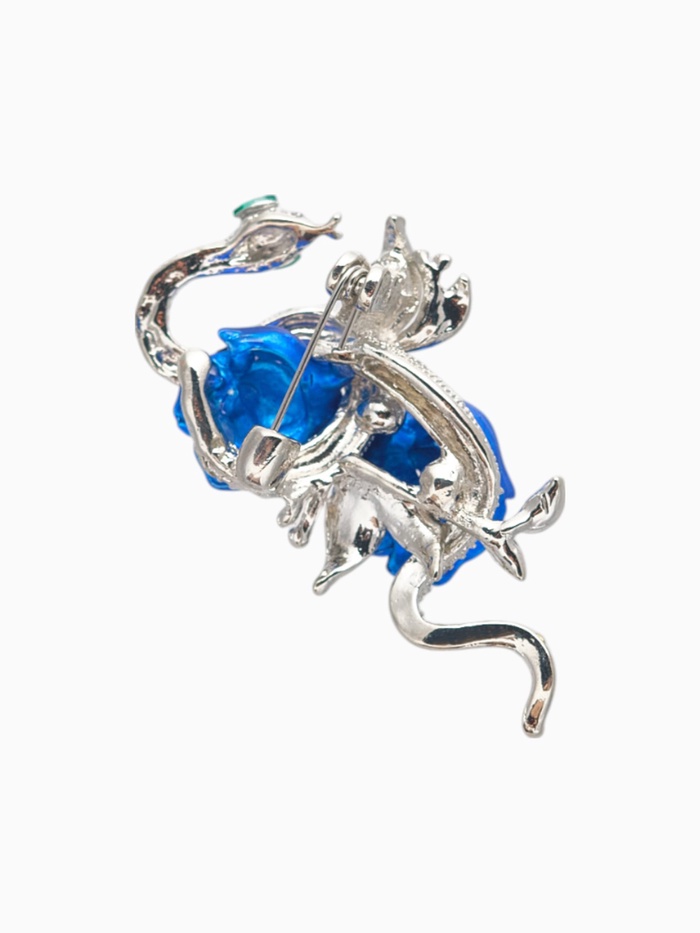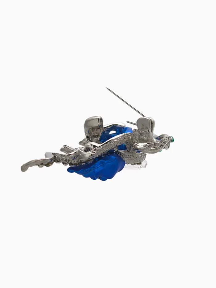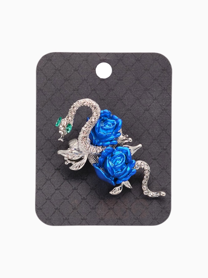 Грациозная и загадочная, эта брошь в форме змеи притягивает взгляд с первого мгновения. Бело-синяя палитра, дополненная сиянием страз и гладкой эмалью, создаёт эффект живого движения, словно змея скользит по ткани. Серебристая фурнитура подчёркивает холодную элегантность образа, делая украшение особенно выразительным на фоне тёмных и однотонных нарядов.