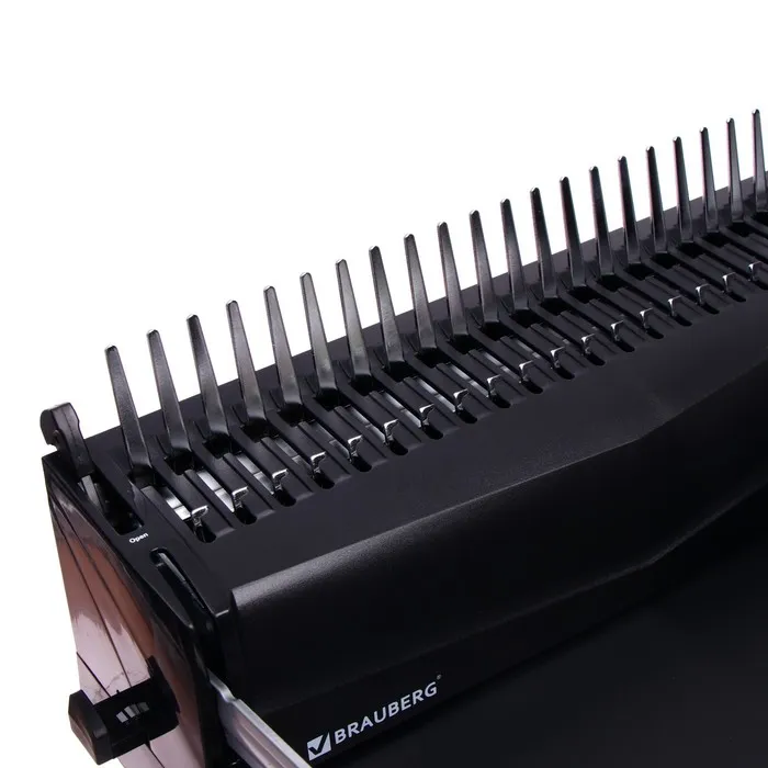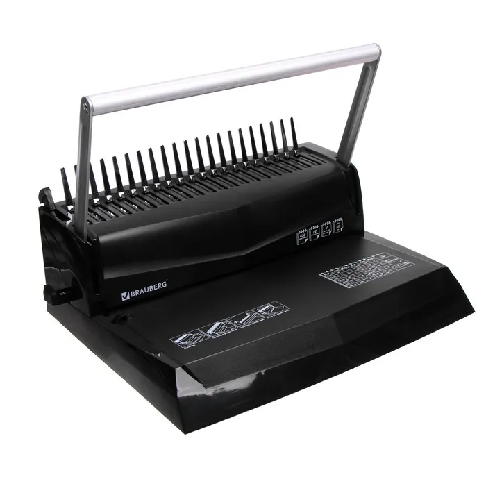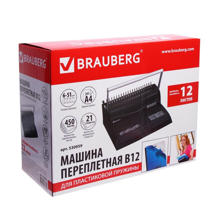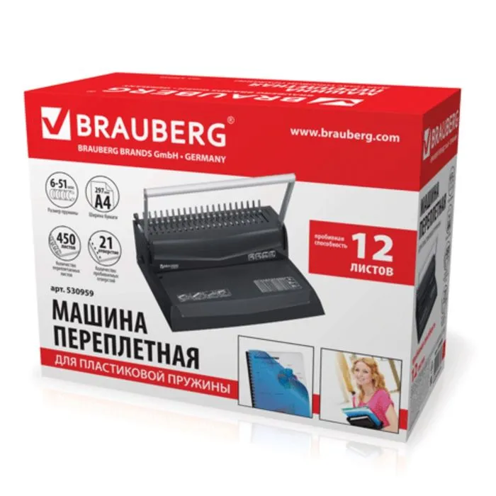 Переплетная машина для пластиковой пружины BRAUBERG "B12" (брошюровщик) идеально подходит для небольшого офиса и дома, где периодически возникает потребность в переплете документов. С ее помощью можно одновременно перфорировать 12 листов плотностью 80 г/м2 и подшивать до 450 листов формата А4, А5 и А3 (в альбомной ориентации). Горизонтальная загрузка документов.Особенности: - максимальная толщина переплета: до 450 страниц при использовании 51-мм пружины; - пробивная мощность: до 12 листов (80 г/м2); - регулировка глубины перфорации (отступа от края бумаги) - 2-5 мм; - ограничитель формата; - ручка во всю ширину;- инструкция по подбору пружин к количеству переплетаемых листов нанесена на машину. Пробивает и переплетает листы формата А3 по короткой стороне, А4, А5, А6, А7 и ниже - по длинной стороне.Размер - 15х35х27,5 см. Вес - 3,5 кг.