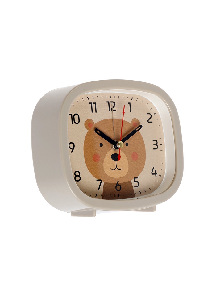 Бежевый будильник с плавным ходом стрелок — это уютный элемент декора, который добавит тепла и гармонии в вашу спальню или детскую. Прямоугольный корпус размером 12.5×10.5 см в нежном бежевом тоне создаёт ощущение спокойствия и комфорта, идеально вписываясь в интерьеры с натуральными оттенками. Кварцевый механизм обеспечивает высокую точность, а плавное движение стрелок минимизирует шум, способствуя мягкому и приятному пробуждению. Бежевый циферблат с изображением милого медвежонка привносит нотку нежности и детской радости, превращая будильник в источник позитивных эмоций.
