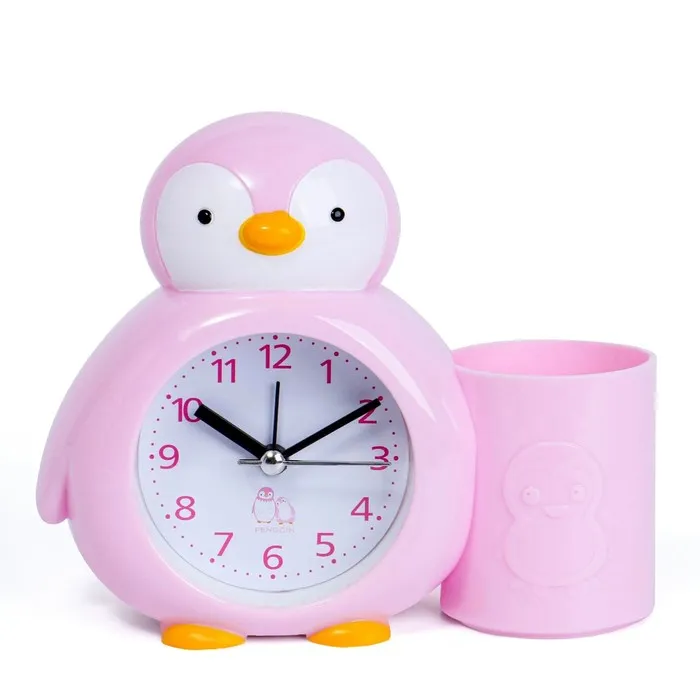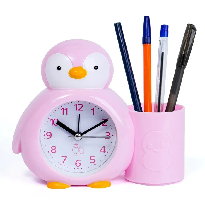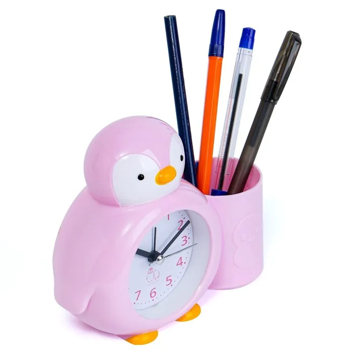 Часы - органайзер с будильником представлены в современном дизайне в форме пингвиненка, они отлично впишутся в интерьер. Интерьерные часы станут прекрасным декором для дома и дачи, их можно поставить как на прикроватную тумбочку в спальне, детской комнате, гостиной так и на стол или на комод в зале, холле или на кухне. Будильник настольный имеет кварцевый механизм, который гарантирует высокую точность хода. Часы настольные обладают громким будильником, ребенку и вам будет комфортно просыпаться, на работу и в школу. Будильник на батарейках не требует частой замены батареек благодаря экономичному механизму. В карандашнице можно хранить канцелярские принадлежности: цветные карандаши, кисти, ручки, ножницы.