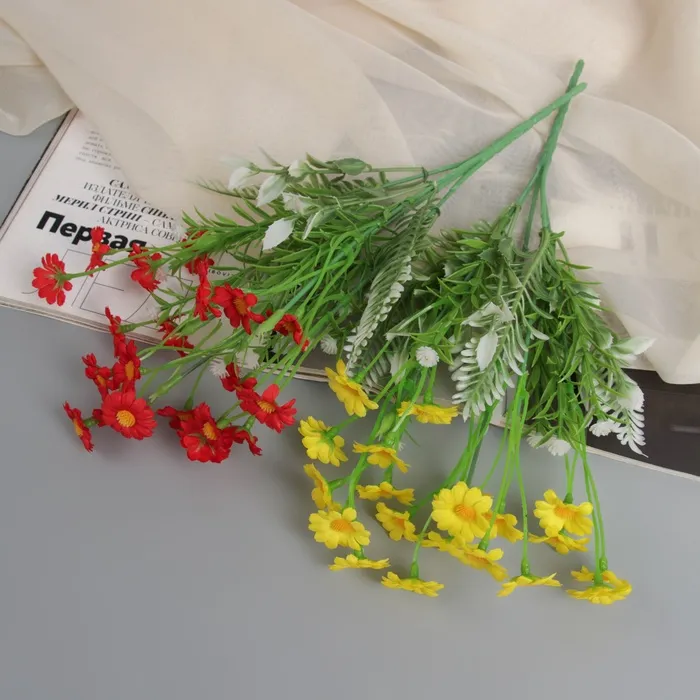 Букет «Полевой галант» высотой 24 см. Стебли изготовлены из пластика. Цветы выполнены из текстиля и пластика, что обеспечивает долговечность и стойкость к внешним воздействиям.