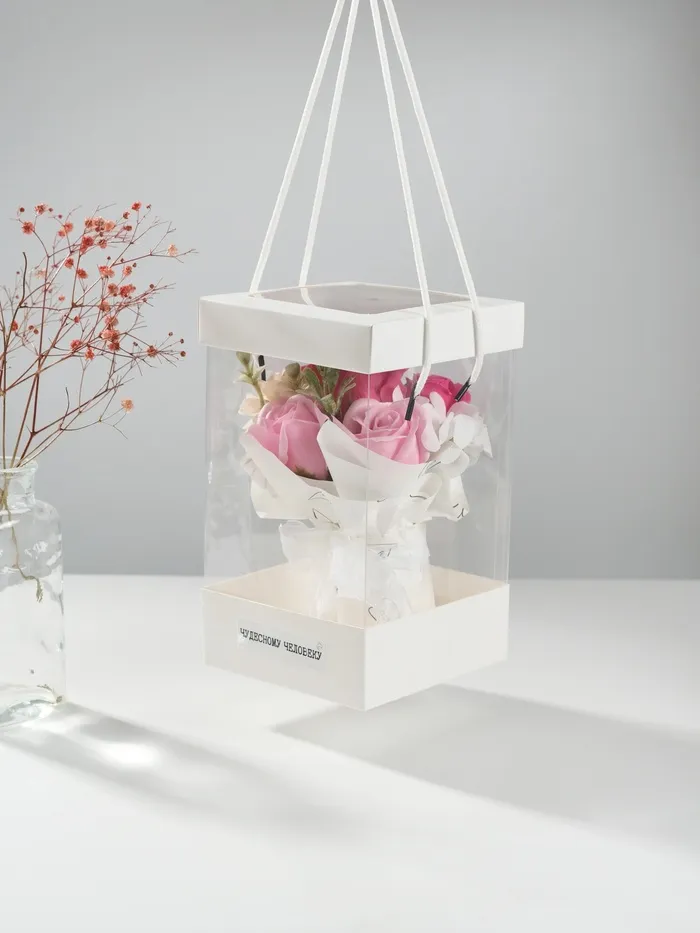 - Эстетика и стиль: нежный розовый цвет и элегантная упаковка в картонной коробке с PVC делают этот букет прекрасным подарком для близких.