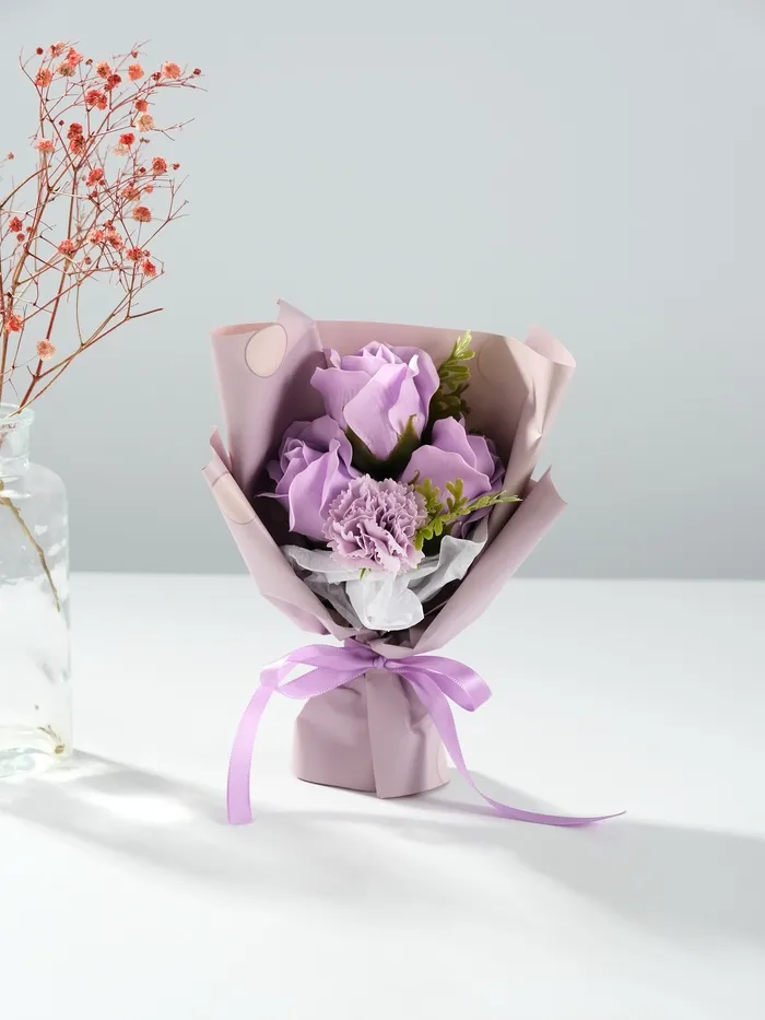Букет из мыльных лепестков для ванны — это необычный и практичный подарок, который сочетает в себе красоту и функциональность. Три нежные розы и гвоздика в сиреневых тонах создают элегантную композицию, которая станет украшением ванной комнаты или приятным сюрпризом для близкого человека. Такой букет подходит для любого праздника и дарит не только эстетическое удовольствие, но и расслабление во время водных процедур.