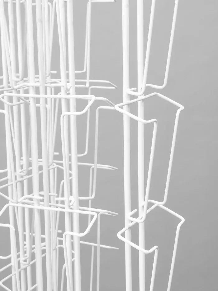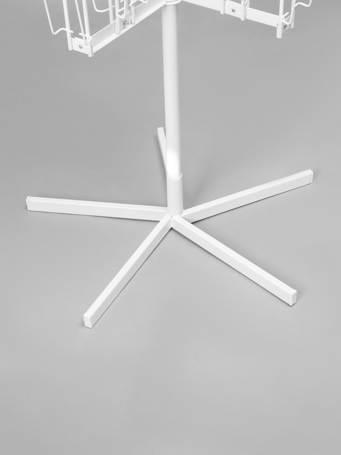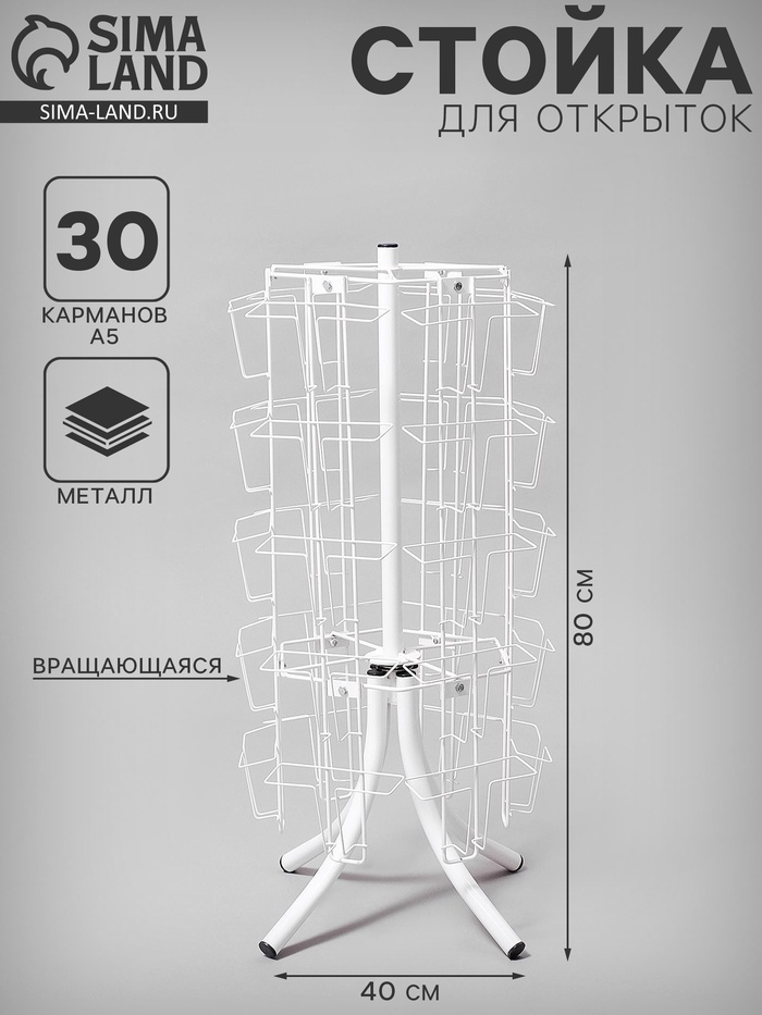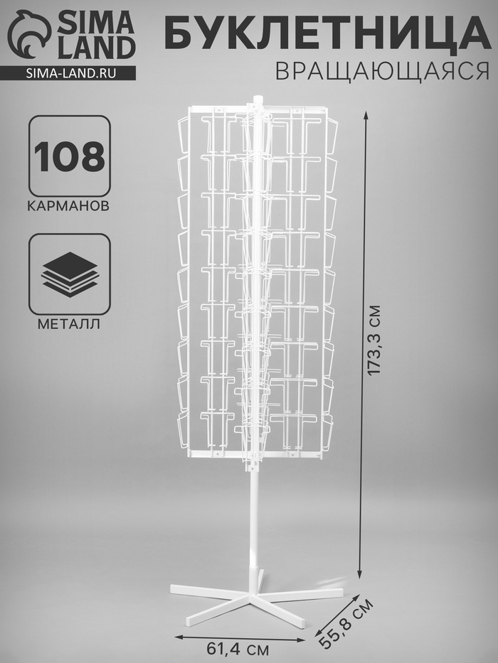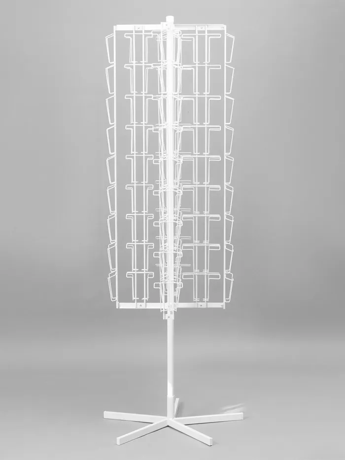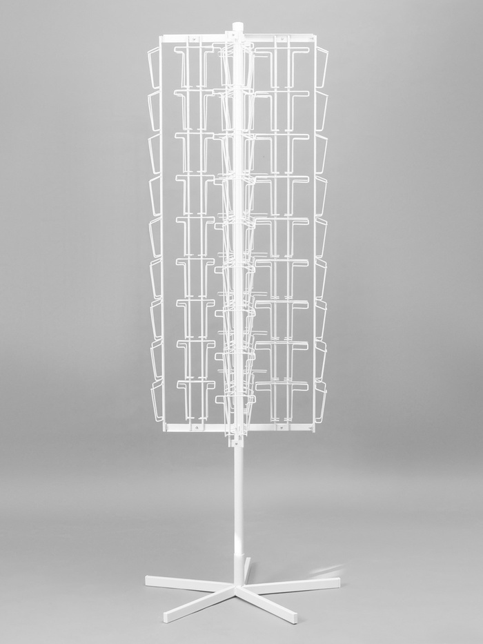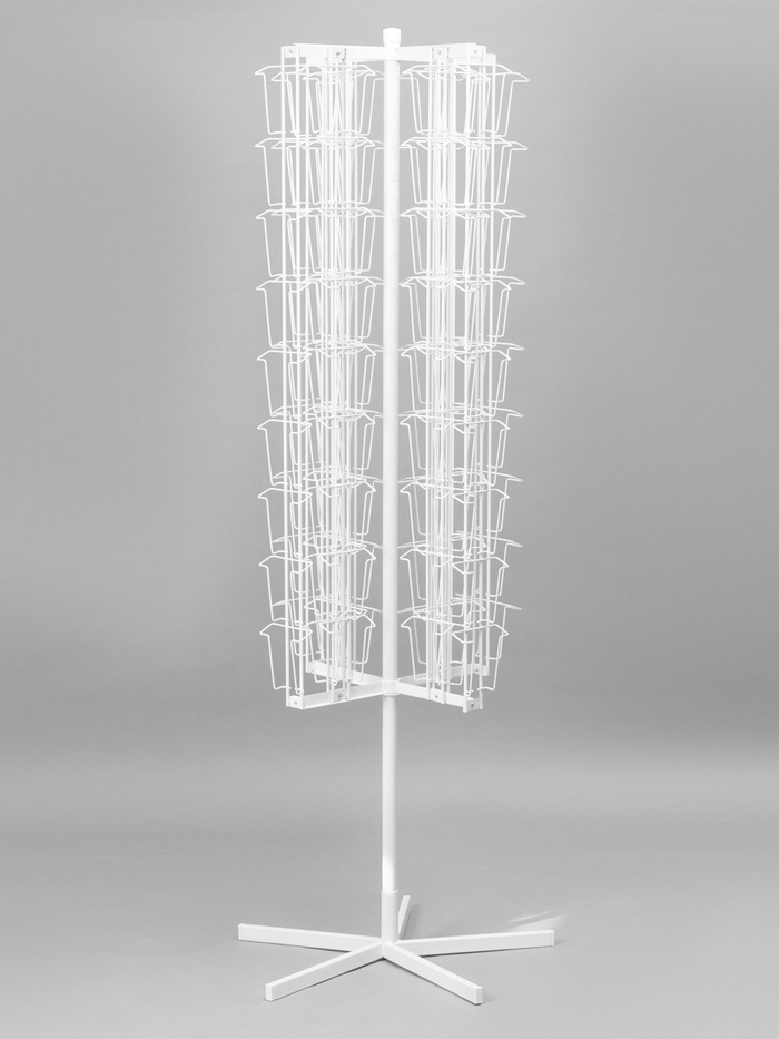 Вращающаяся буклетница предназначена для размещения печатной продукции: открыток, буклетов и пр. В конструкции есть 108 ячеек: 54 отсека — для товаров формата А5 и 54 — для А6. Оборудование удобно размещать в центральной части торгового или выставочного помещения.