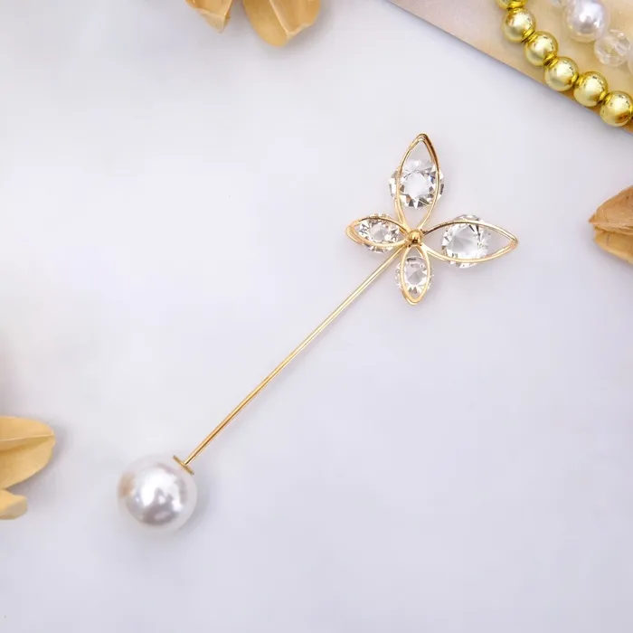 Объёмная брошь в форме бабочки длиной 8,5 см поражает своей изящной белоснежной красотой и утончённым золотым обрамлением. Эффектный аксессуар из металла с вставками из жемчуга, стекла и пластика создаёт впечатление лёгкости и воздушности, подчёркивая женственность и изысканный вкус.