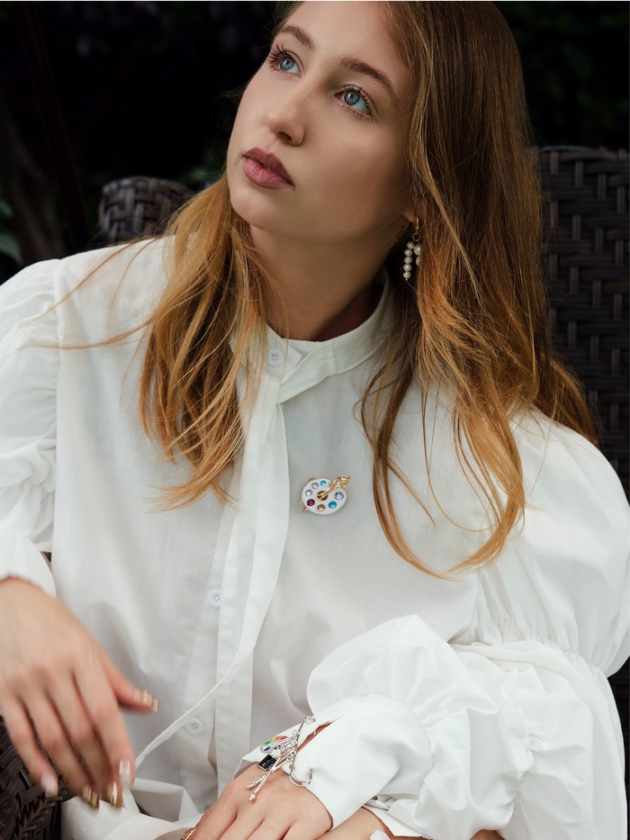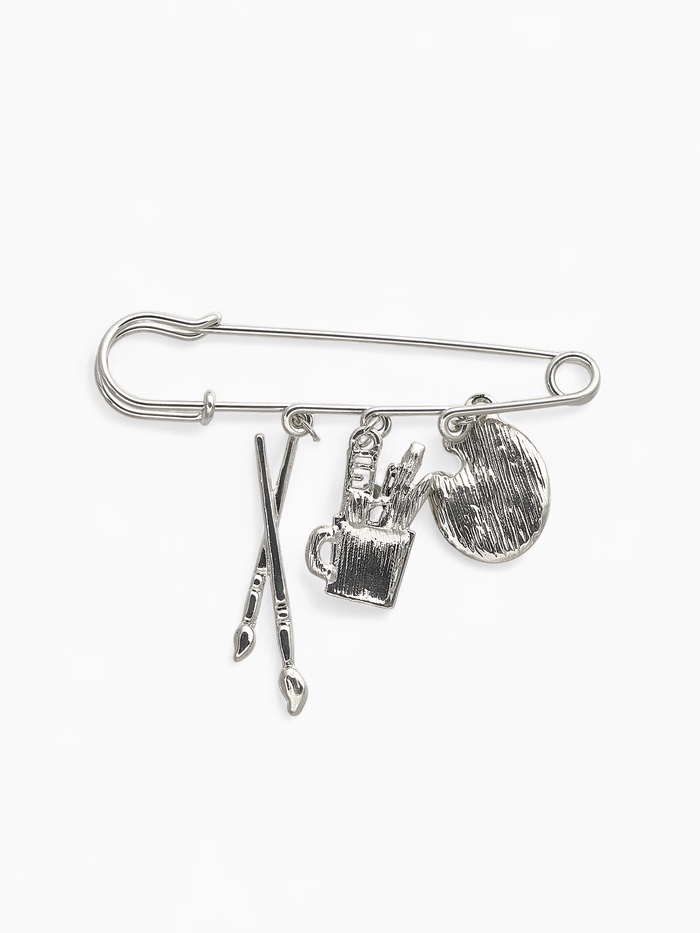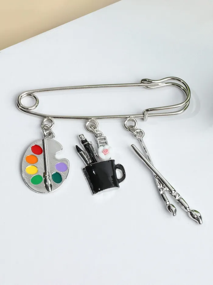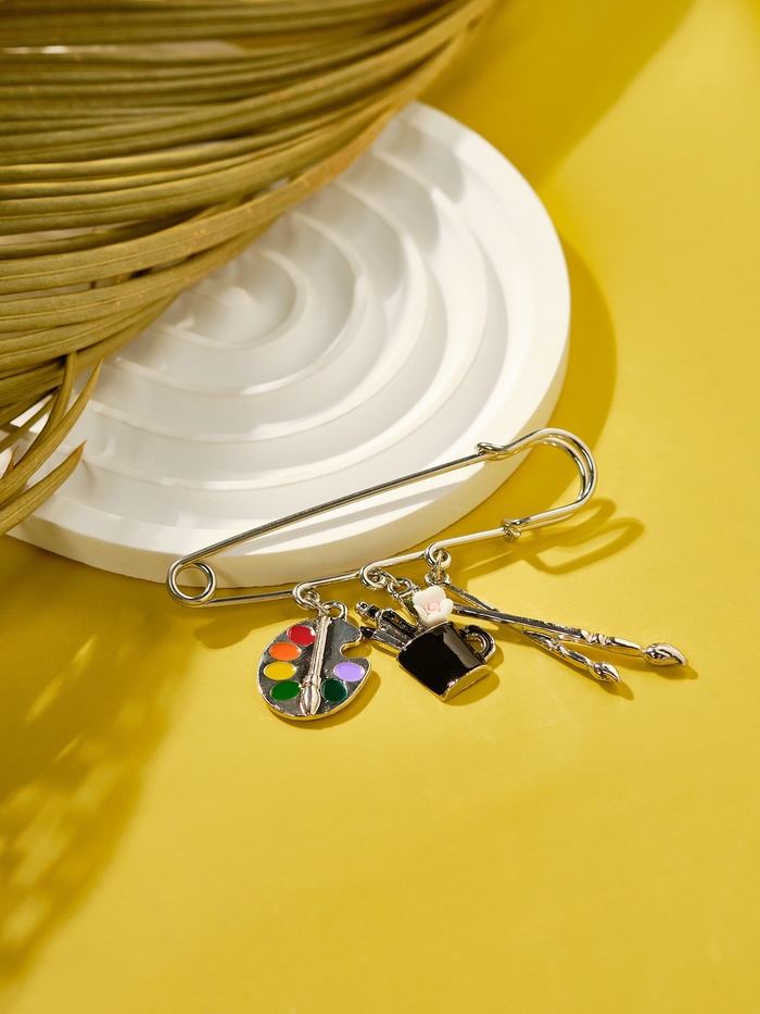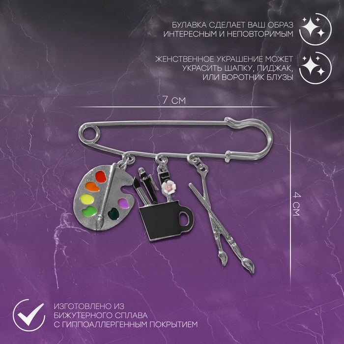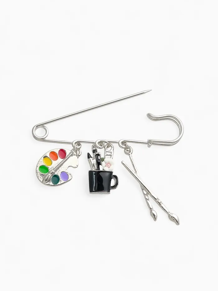 - Творческий дизайн: булавка с подвесками в виде художественных атрибутов вдохновляет на творчество и самовыражение, добавляя уникальности вашему стилю.