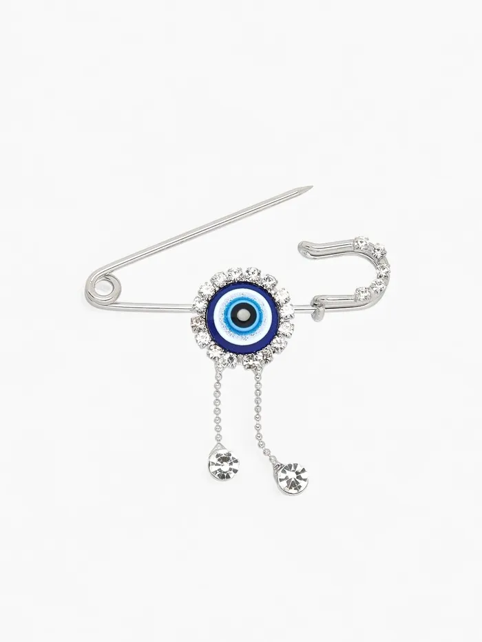 Эта изящная булавка-оберег сочетает в себе глубокий символизм и утончённый дизайн. Длина 5 см, выполненная из прочного металла с серебристой фурнитурой, она украшена стеклянной вставкой в виде глаза с подвесками, которые нежно переливаются бело-синими оттенками. Такой аксессуар станет не только стильным дополнением к образу, но и надёжной защитой от негативных энергий.