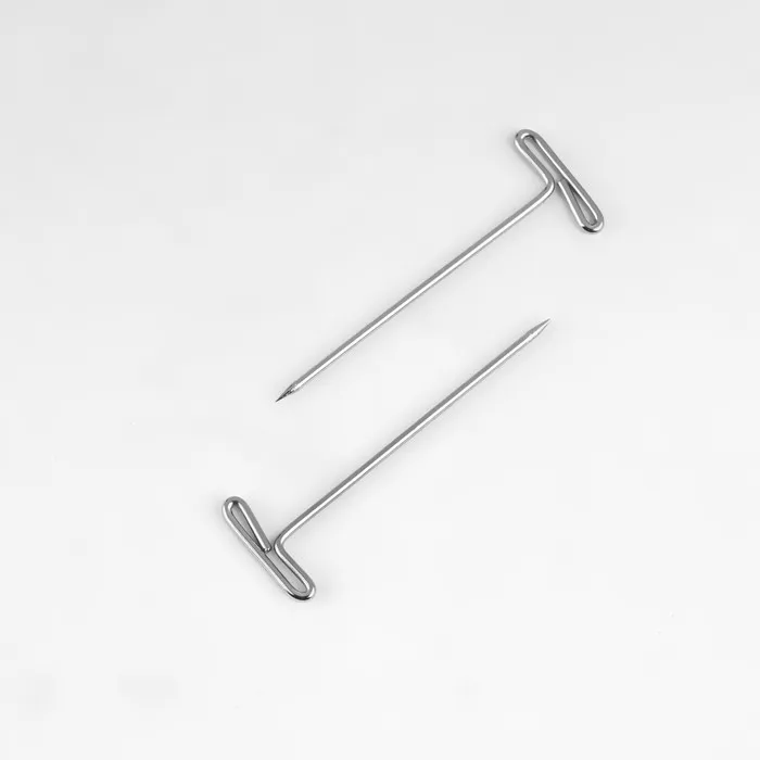 Металлические булавки с широкой шляпкой в форме буквы Т предназначены для пошива верхней одежды и работе с пальтовыми или плотными джинсовыми тканями. Благодаря необычной форме булавки не гнутся и могут выдерживать большой вес тяжёлой ткани,