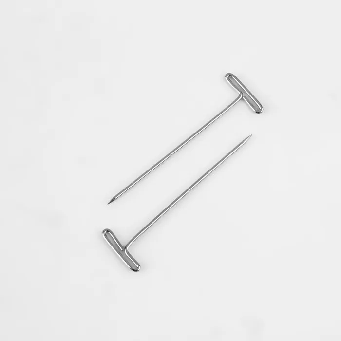 Металлические булавки с широкой шляпкой в форме буквы Т предназначены для пошива верхней одежды и работе с пальтовыми или плотными джинсовыми тканями. Благодаря необычной форме булавки не гнутся и могут выдерживать большой вес тяжёлой ткани,
