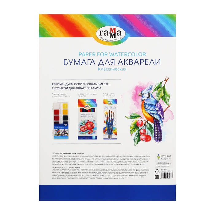 Акварельная бумага ГАММА серии "Классическая" состоящая из 10 листов плотностью 200 г/м2 отлично походит для рисования всеми видами водорастворимых красок, а также фломастерами и карандашами, мелками, ручками.
