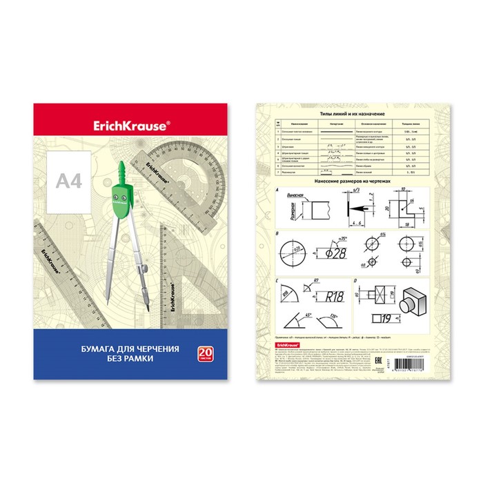 Бумага для черчения А4, 20 листов, блок 200 г/м², ErichKrause, без рамки, в картонной папке — Характеристики