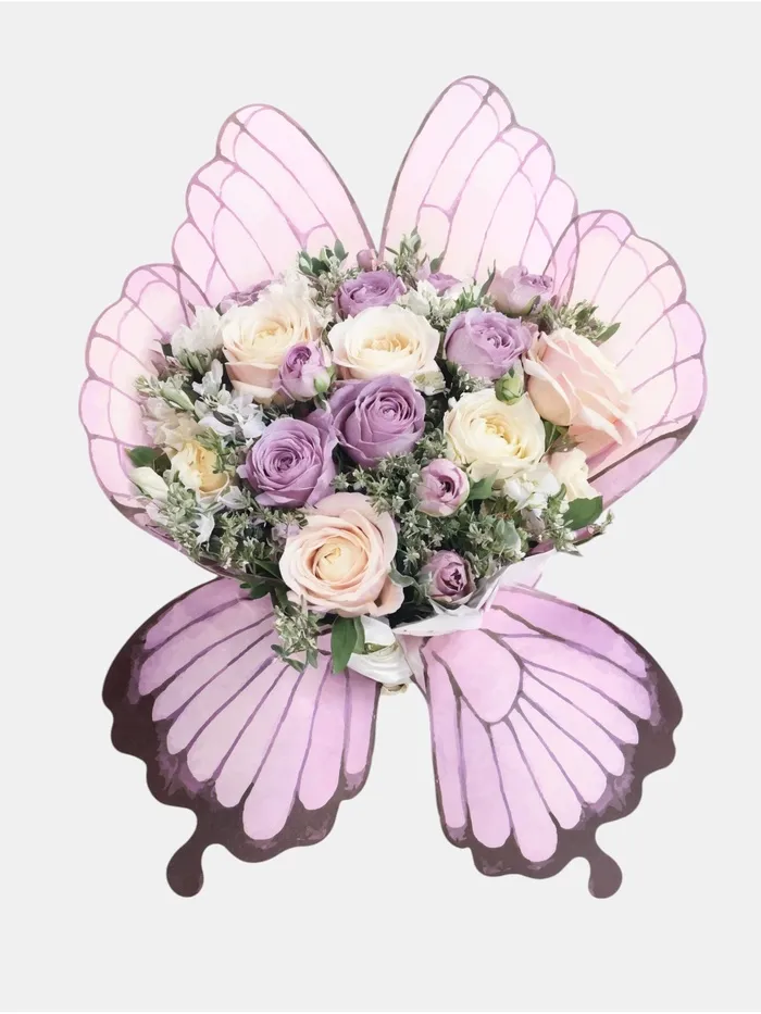 С её помощью вы легко создадите стильную упаковку для букета, которая запомнится надолго. Узор в виде крыльев бабочки символизирует лёгкость и красоту, а нежный сиреневый цвет добавляет утончённости. Бумага проста в использовании: её можно складывать, завязывать или использовать как фон для цветочной композиции.