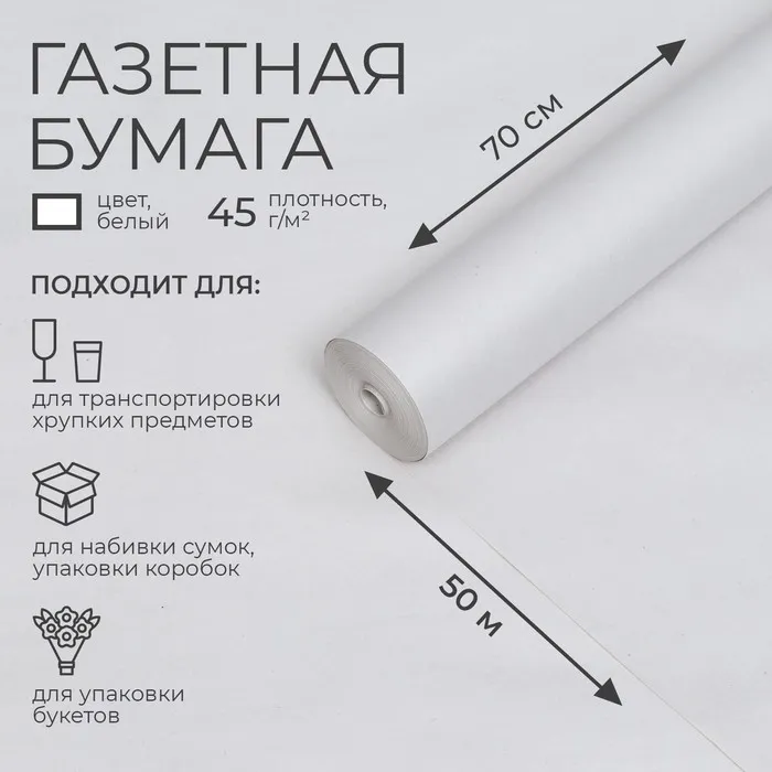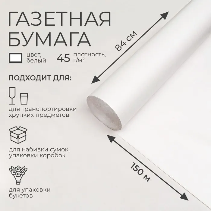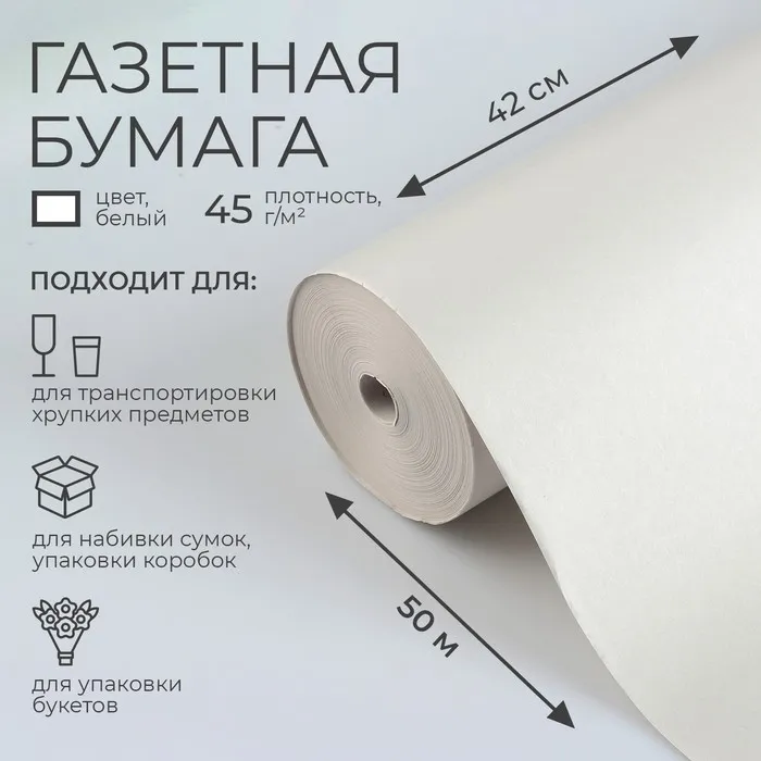 Газетная бумага изготовлена из древесной целлюлозы. Её применяют для набивки сумок, упаковки коробок, товаров промышленного назначения и цветов, а так же в хозяйственных магазинах. В эту бумагу упаковывают хрупкие и бьющиеся предметы – прокладывают посуду при транспортировке.