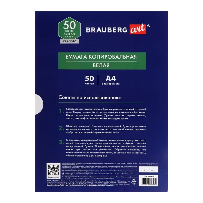 Бумага копировальная А4 50л BRAUBERG ART "CLASSIC", белая 113854 — Характеристики