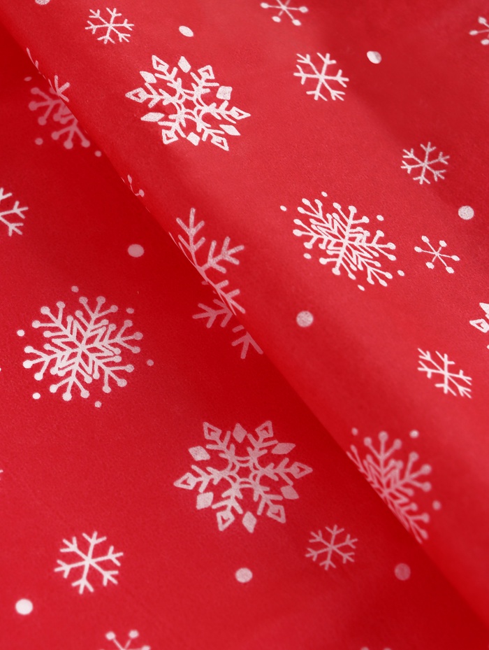 - Практичный односторонний дизайн: Снежинки украшают только лицевую сторону. Это решение подчеркивает глубину красного цвета с изнанки и делает упаковку экономной — вы платите только за видимый декор. Обратная сторона — гладкая и однотонная.