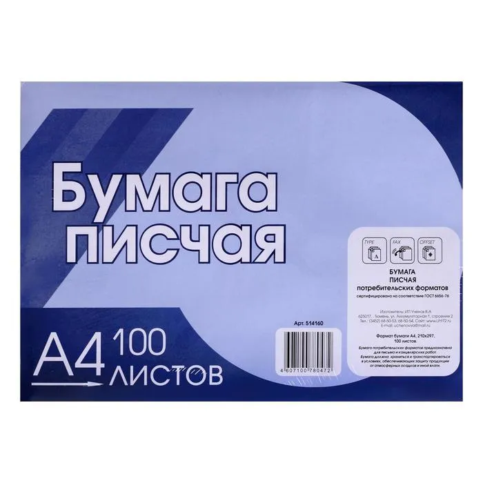 Бумага писчая А4, 100 листов, плотность 65 г/м², белизна 90-96%, эконом, в плёнке — Характеристики