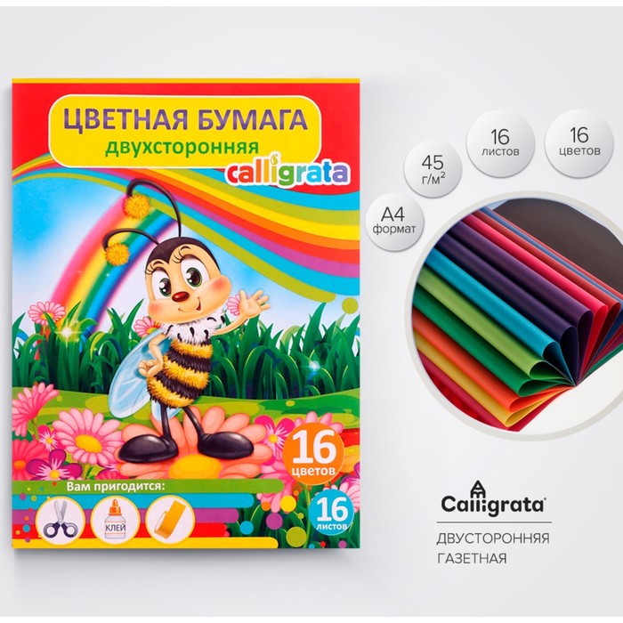 Бумага цветная А4, 16 листов, 16 цветов, Calligrata, газетная, двусторонняя, на скобе — Характеристики