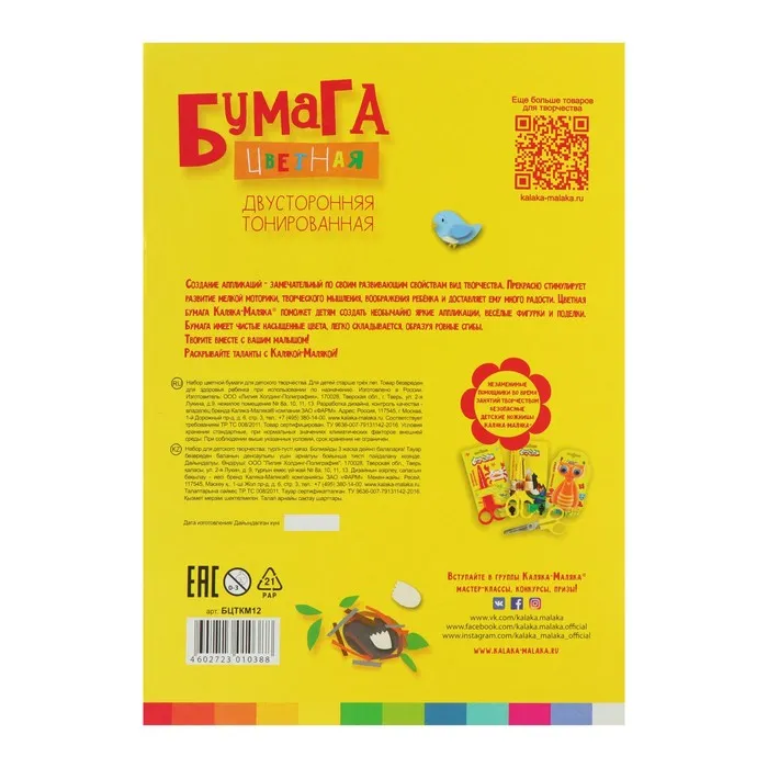 Бумага цветная двусторонняя А4, 12 листов, 12 цветов "Каляка-Маляка" — Характеристики