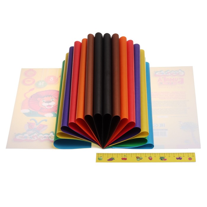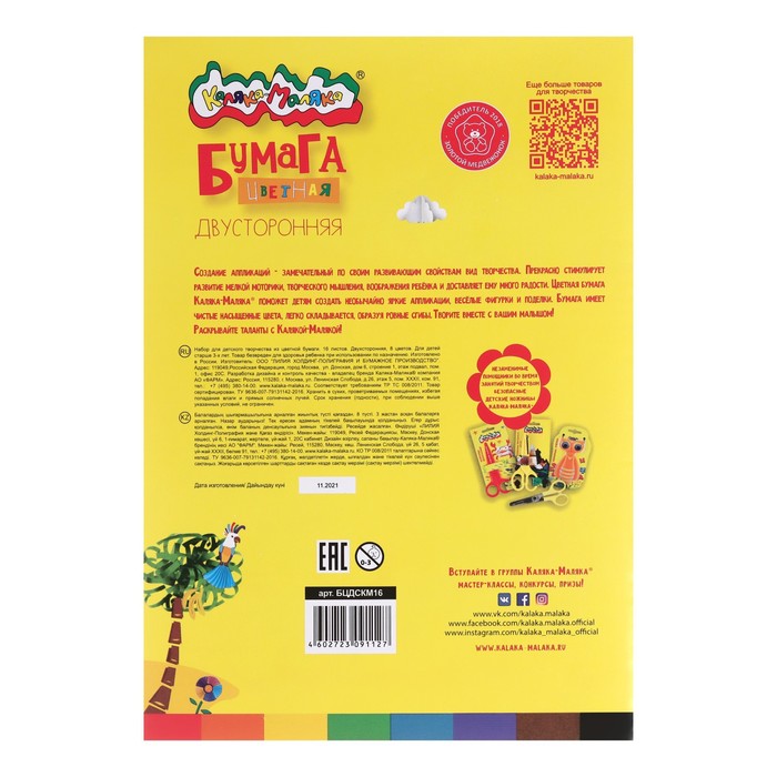 Бумага цветная двусторонняя А4 на скрепке, 16 листов, 8 цветов "Каляка-Маляка" — Характеристики