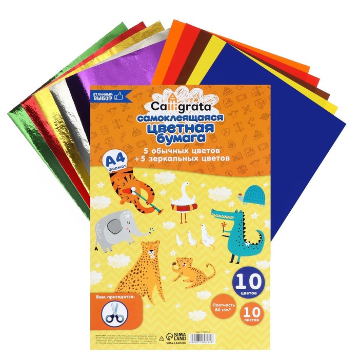 Бумага цветная самоклеящаяся А4, 10 листов, 10 цветов (5 обычных + 5 зеркальных), 80 г/м2 — Характеристики