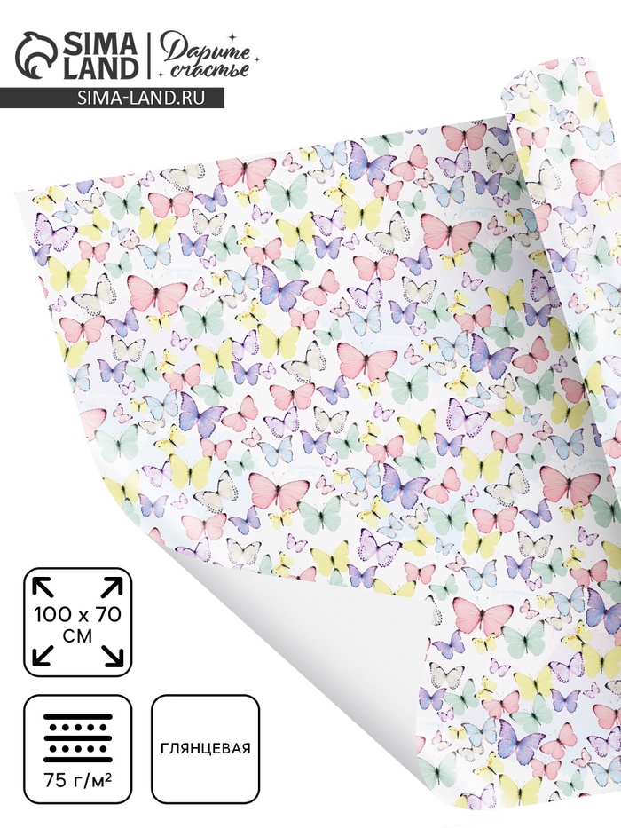 Бумага упаковочная глянцевая «Светлые бабочки», 70×100 см