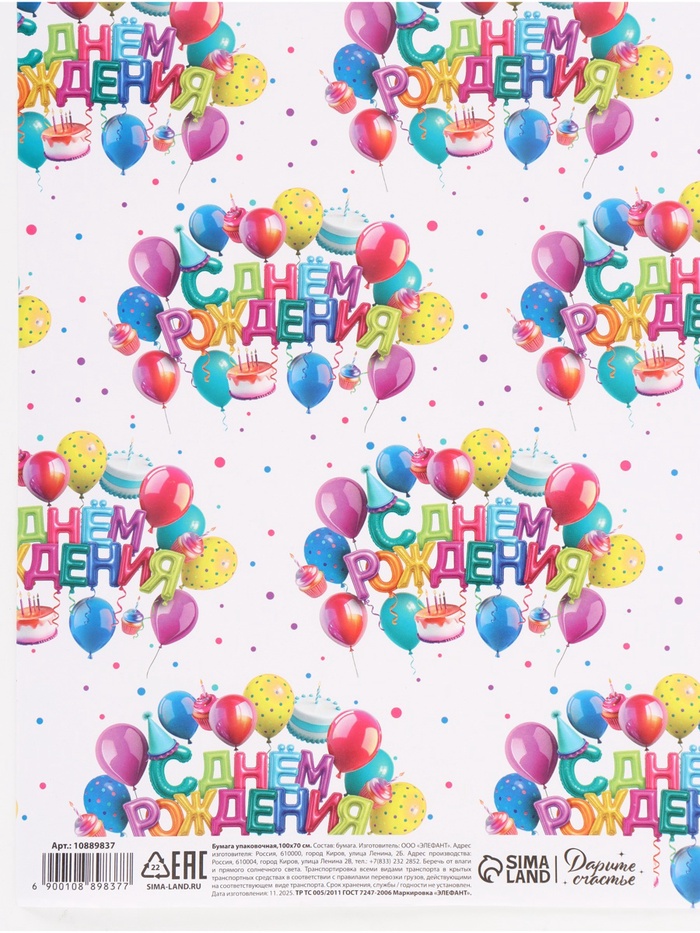 Бумага упаковочная глянцевая «С Днём рождения», 70 × 100 см — Характеристики