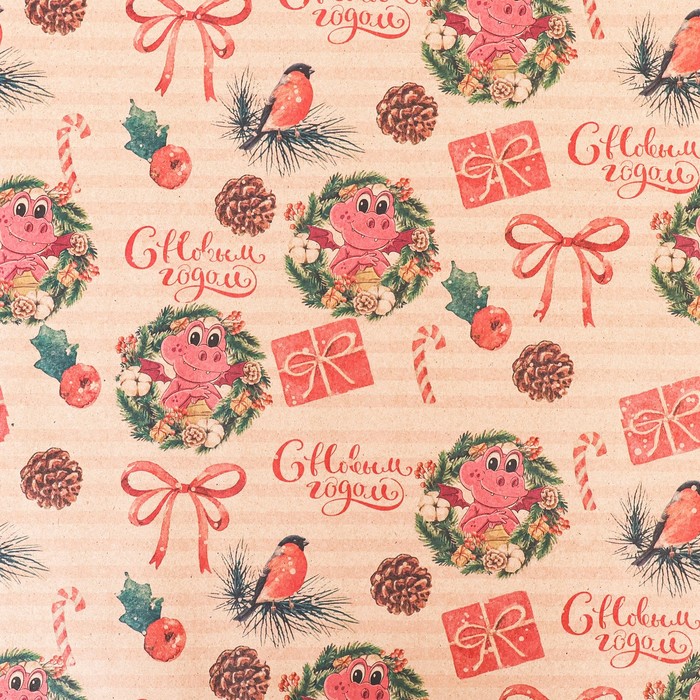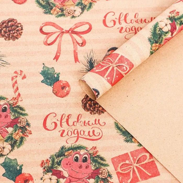 Бумага упаковочная крафт бурый « Дракоша в венках», 70×100 см,1 лист — Характеристики